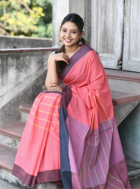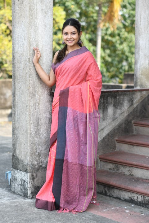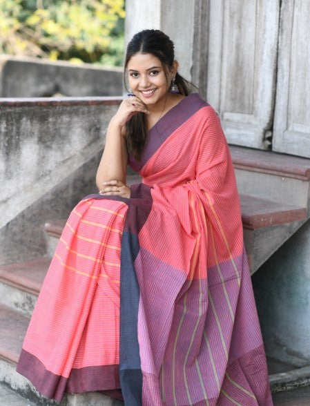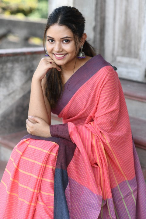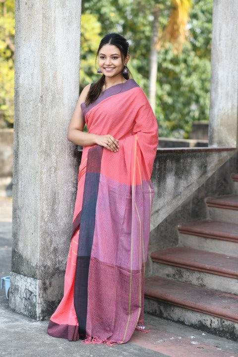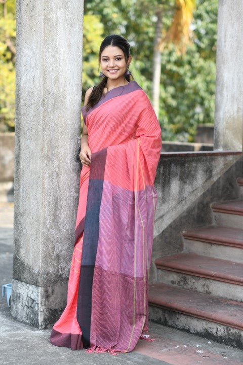 Handwoven, Soft, Lightweight, pure Cotton saree, adorned with cute braided tussles.