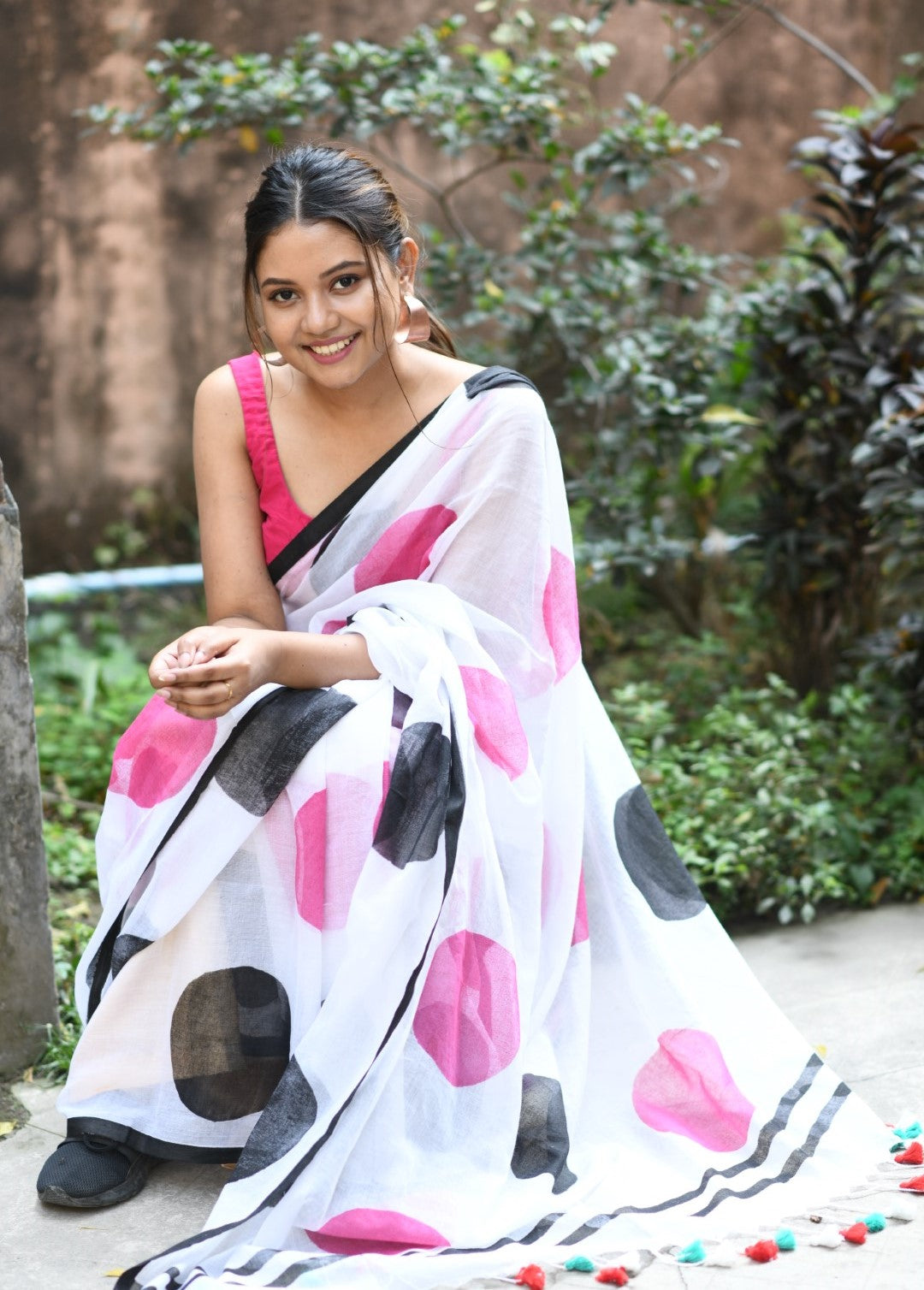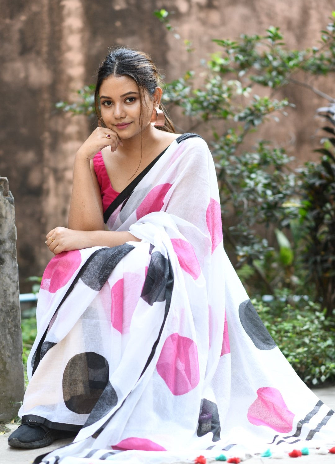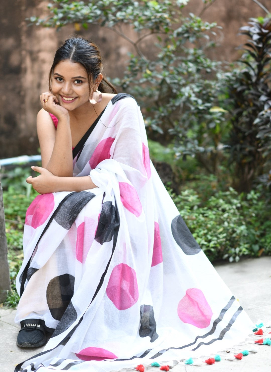 Handwoven, Soft, Lightweight, pure Cotton saree with polka dots and adorned with cute braided tussles.