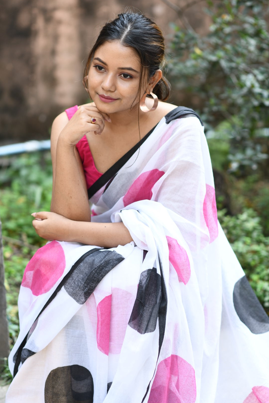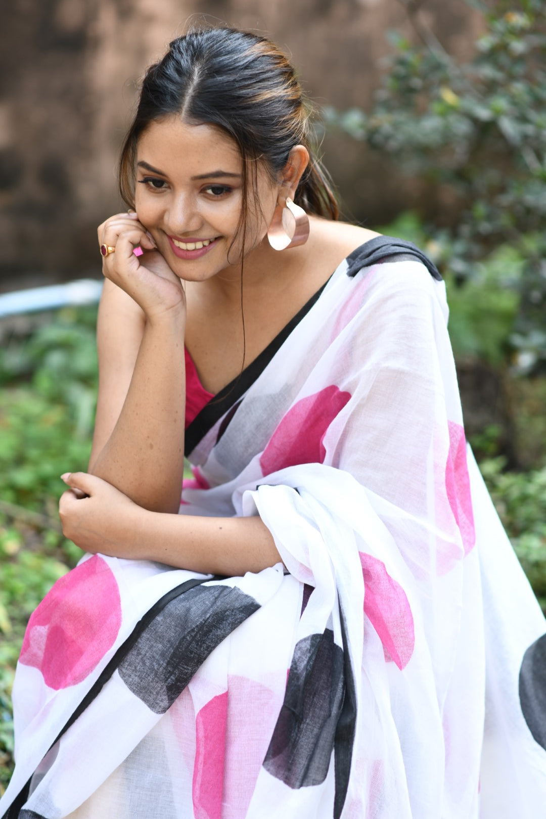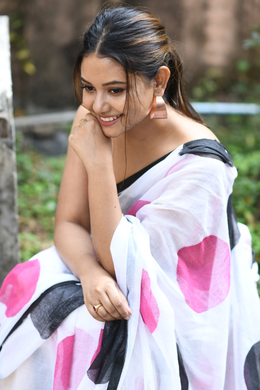 Handwoven, Soft, Lightweight, pure Cotton saree with polka dots and adorned with cute braided tussles.