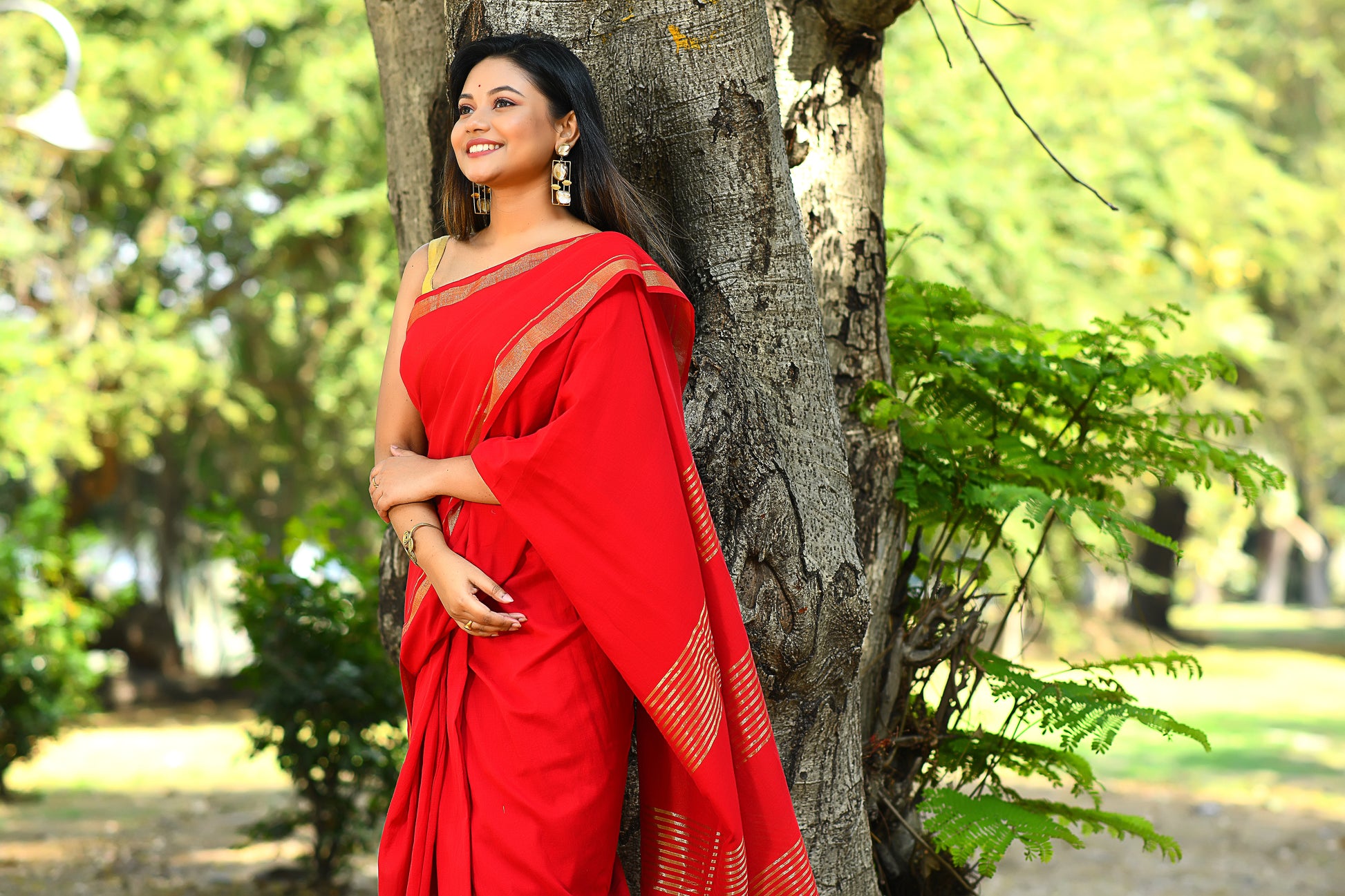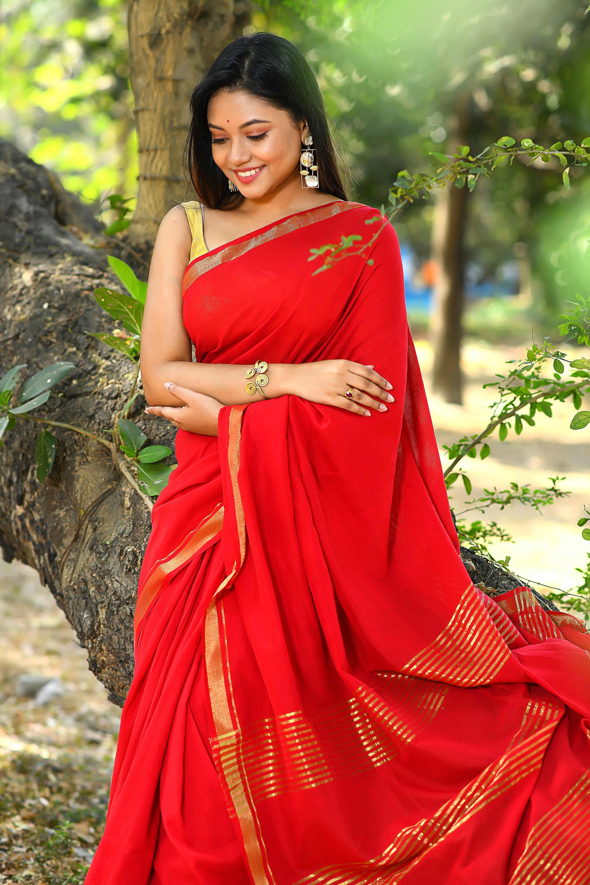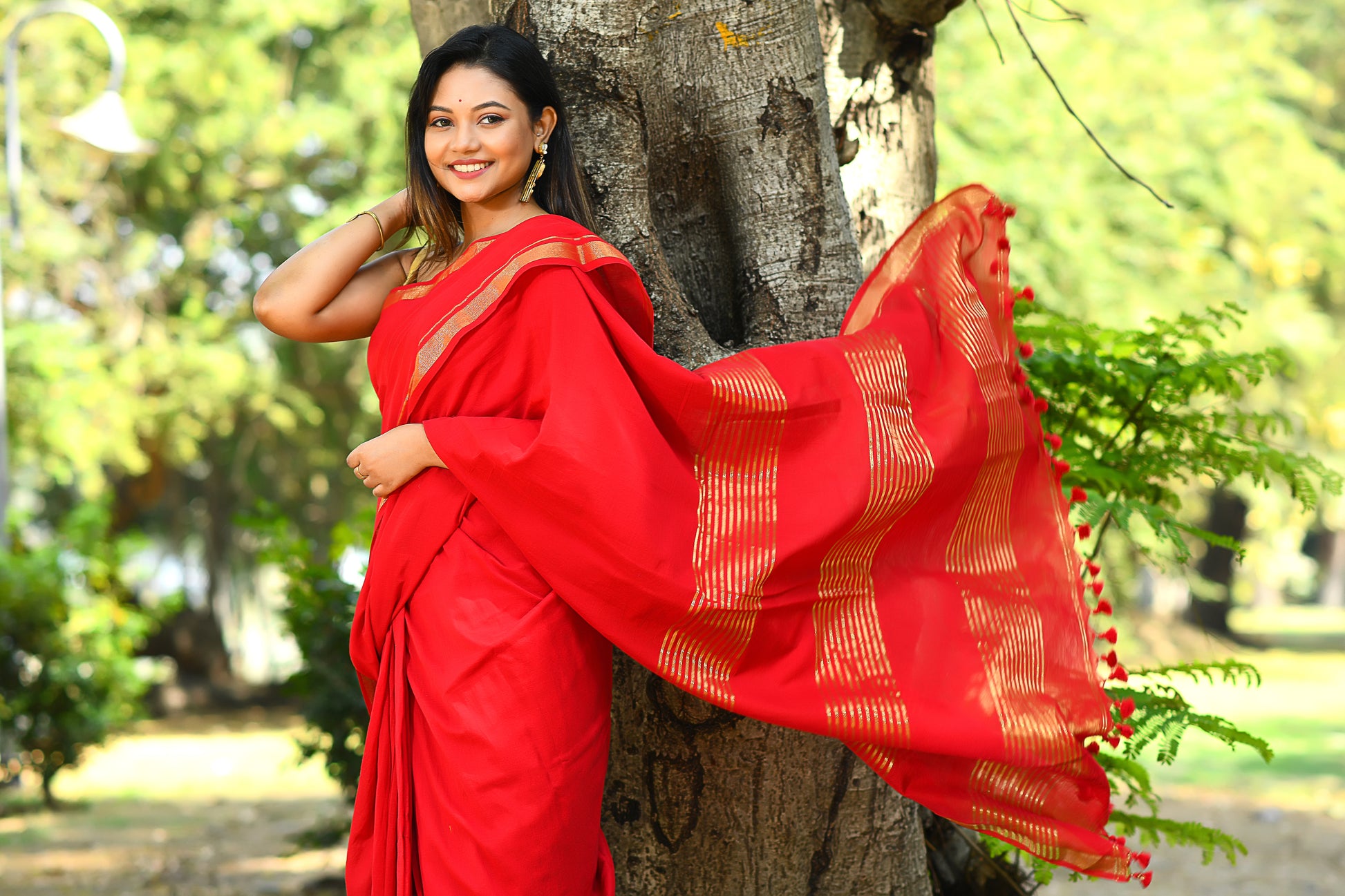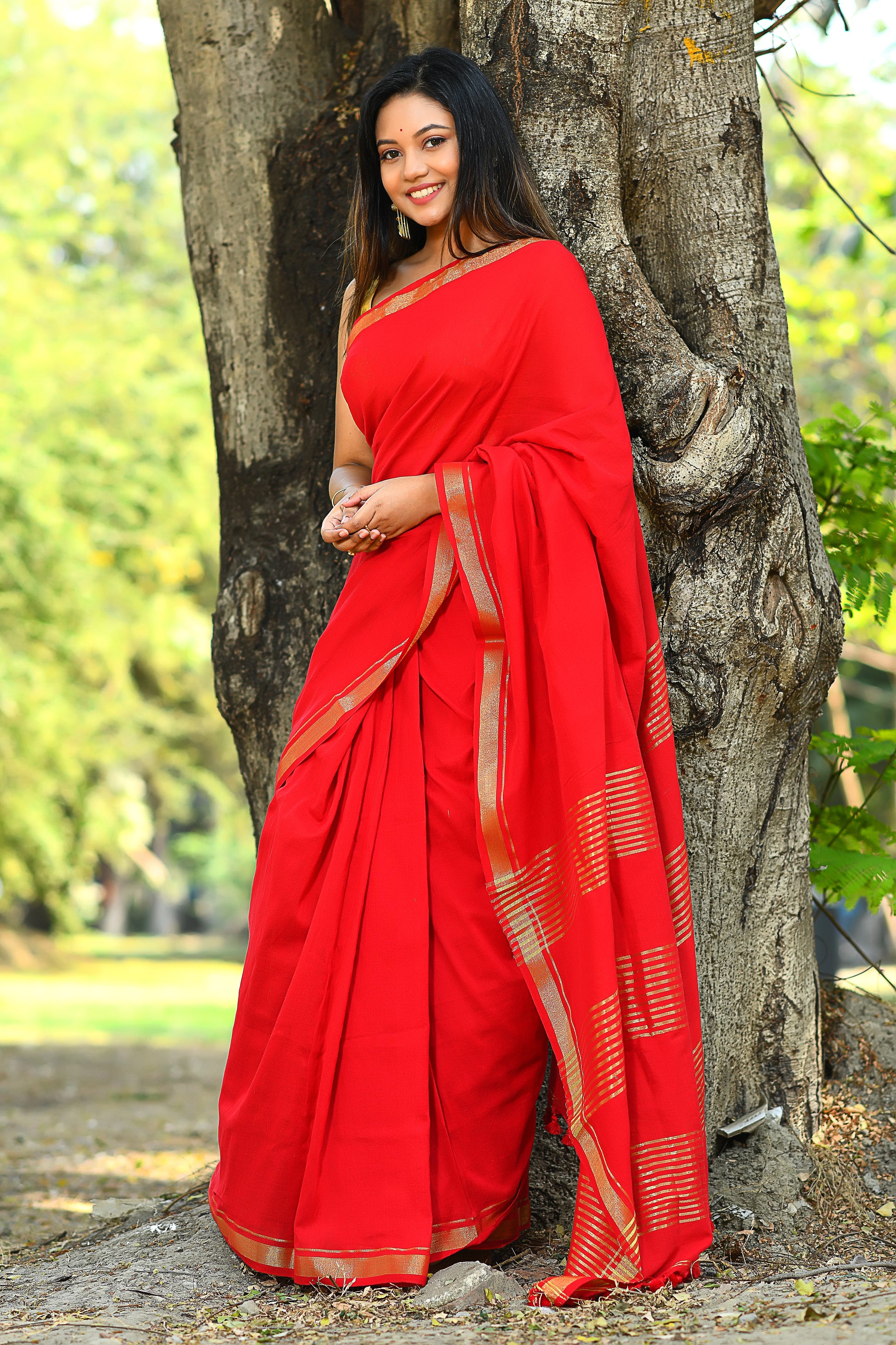 Handwoven, Soft, Lightweight, pure Cotton saree, with gold zari border and zari strips on palla. And adorned with cute braided tussles.