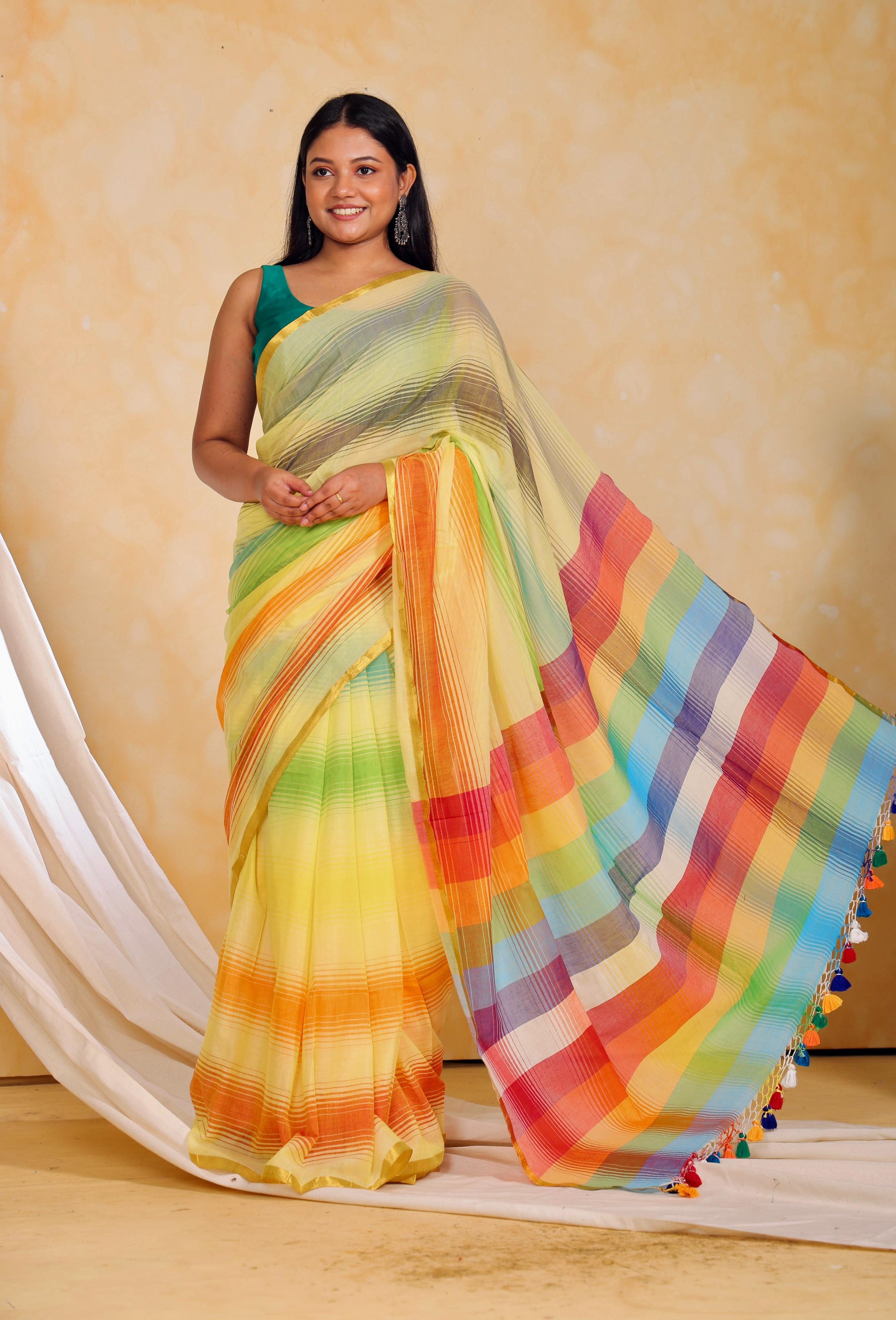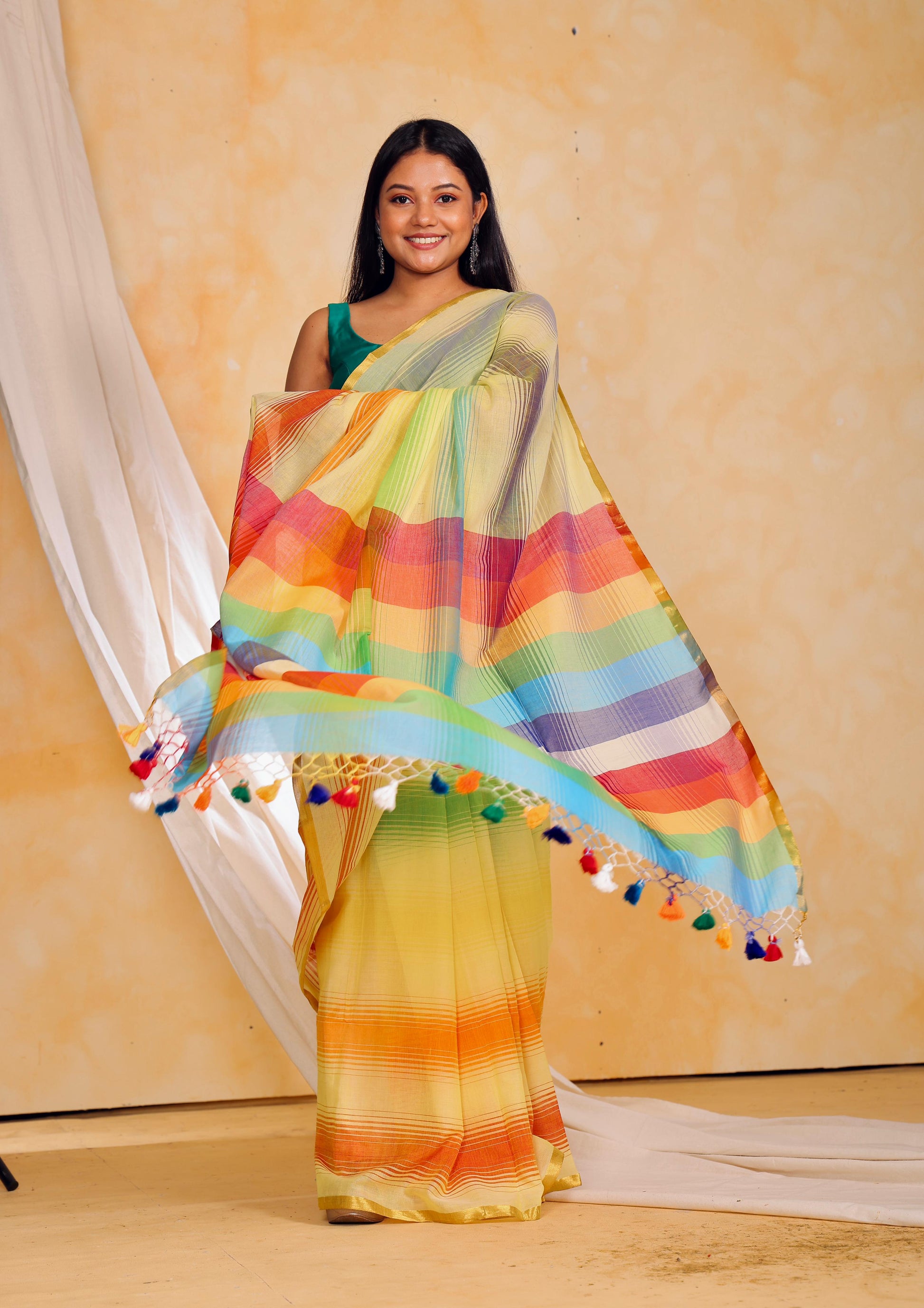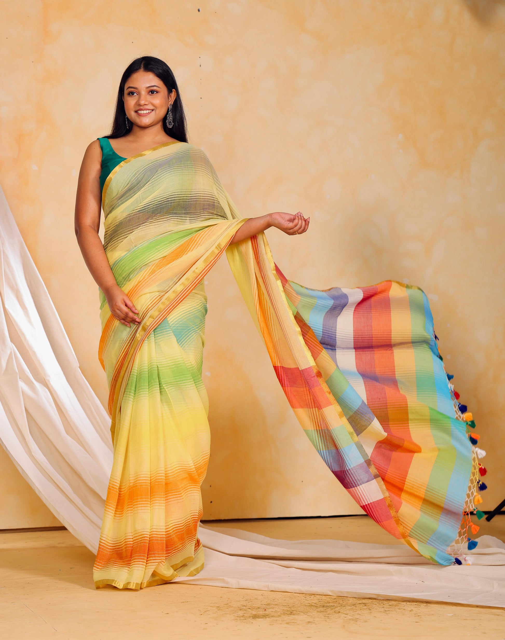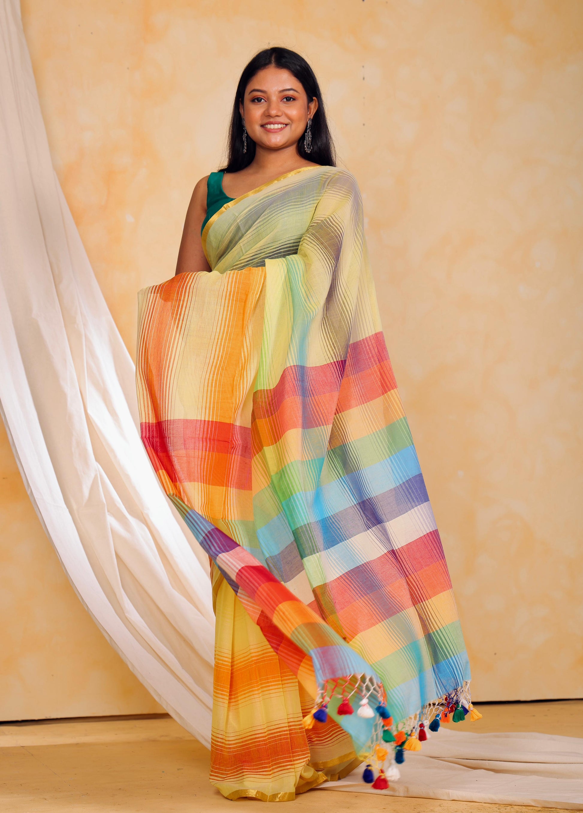Multi colour pure Cotton Saree with Zari border and cute tussles on the palla