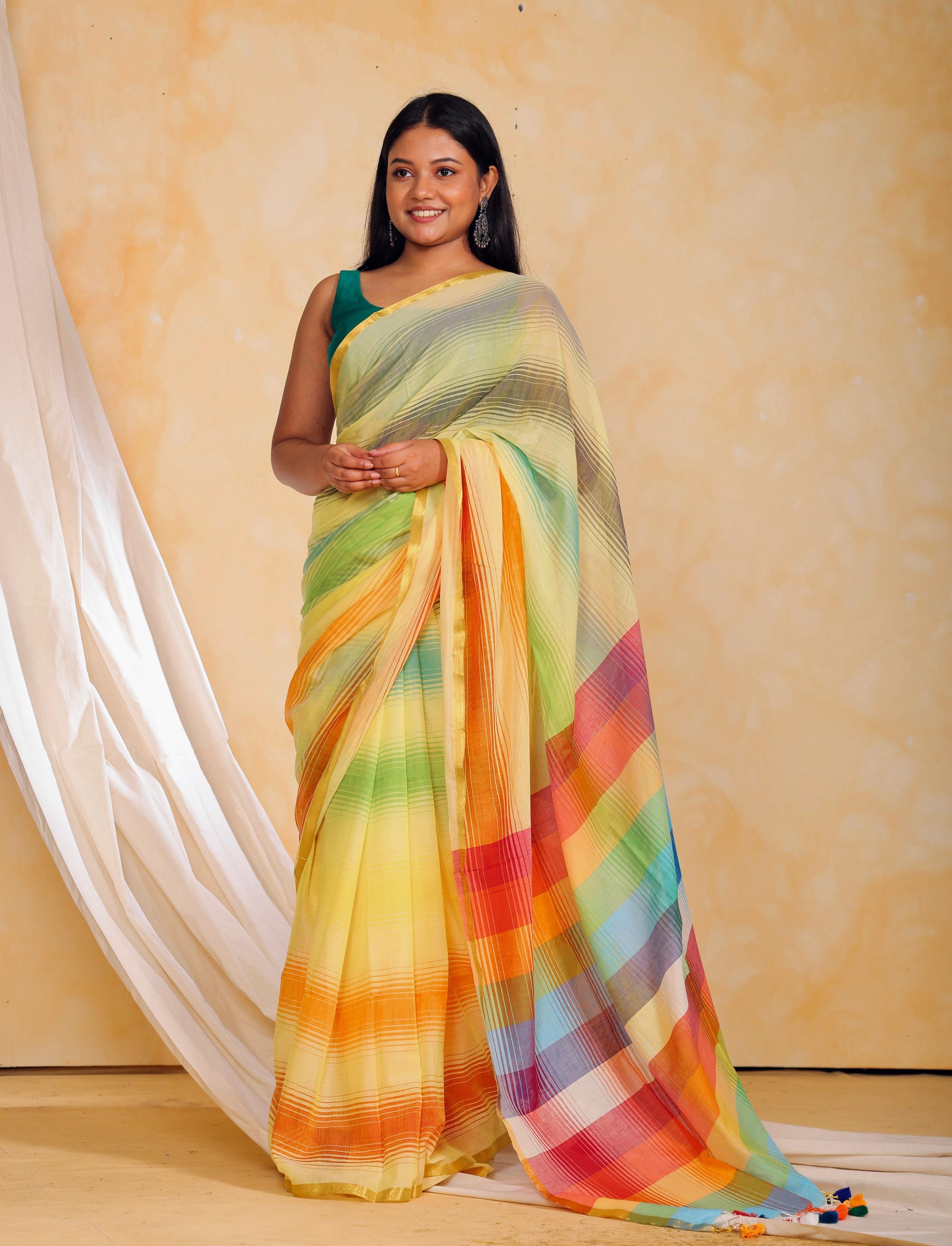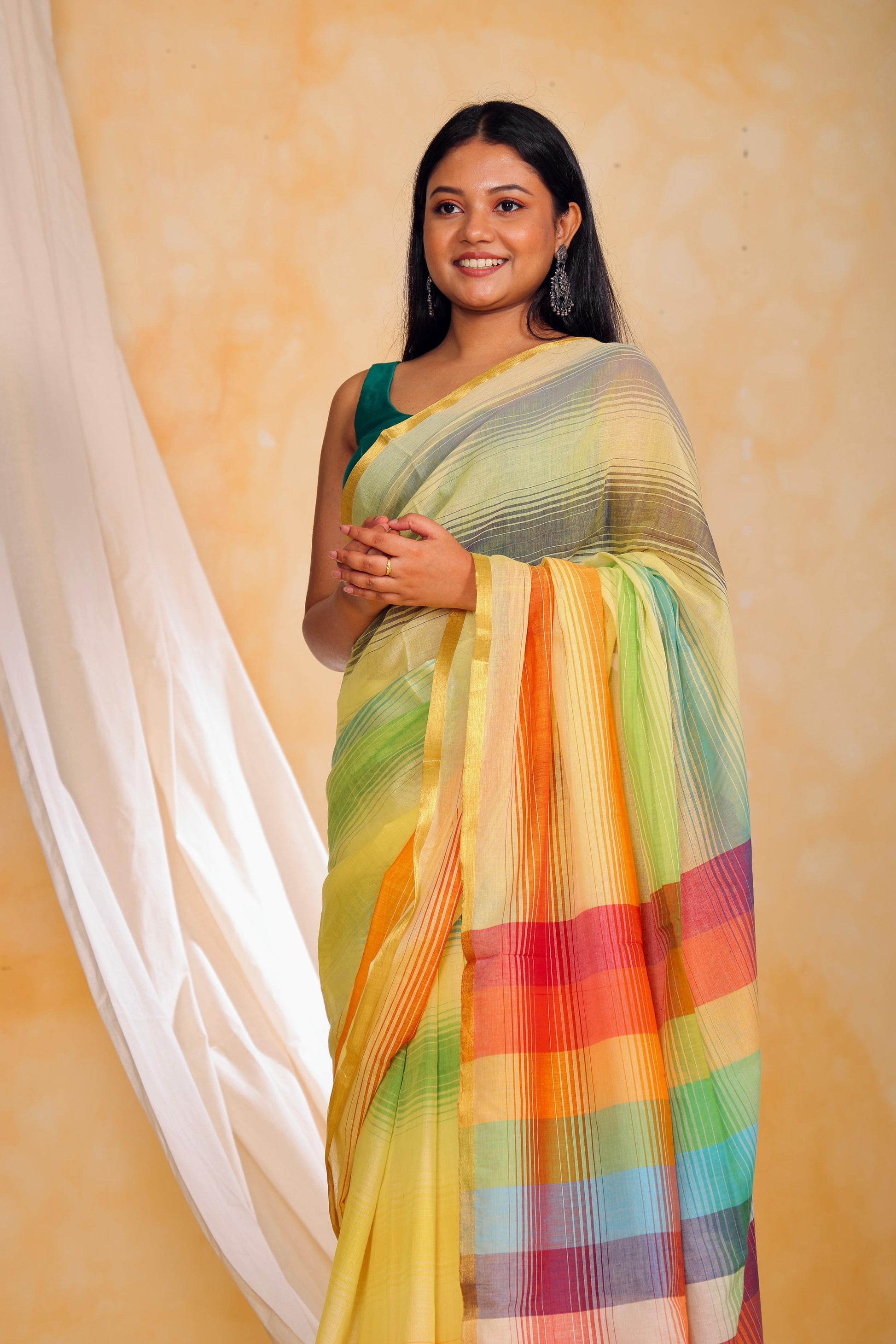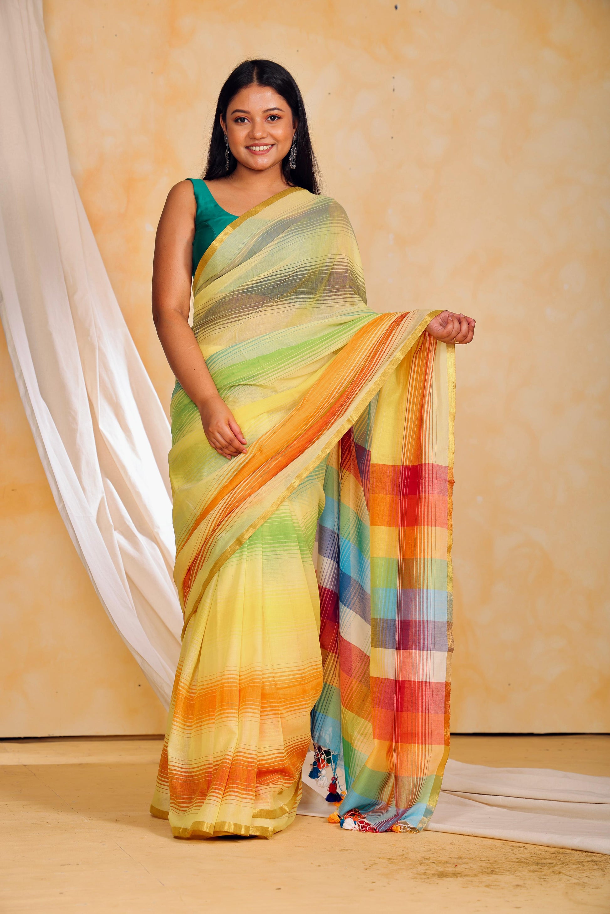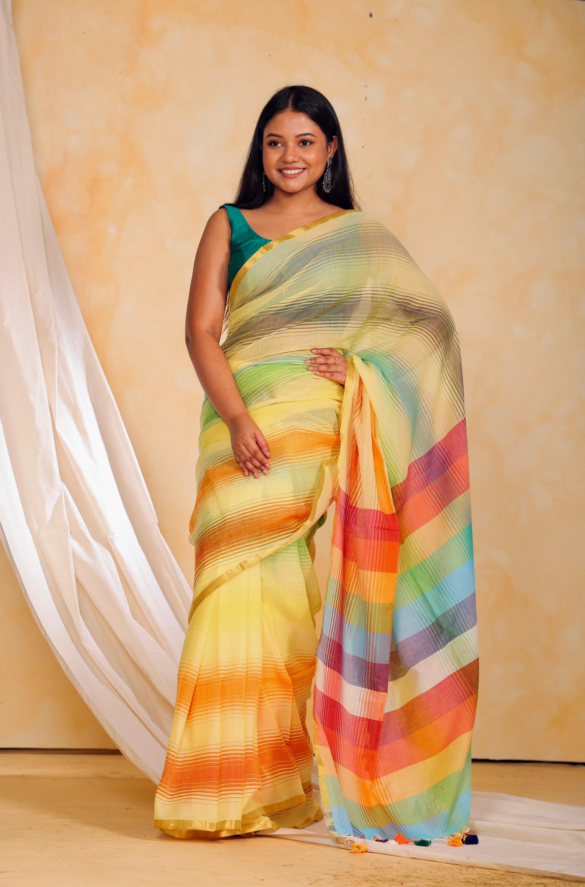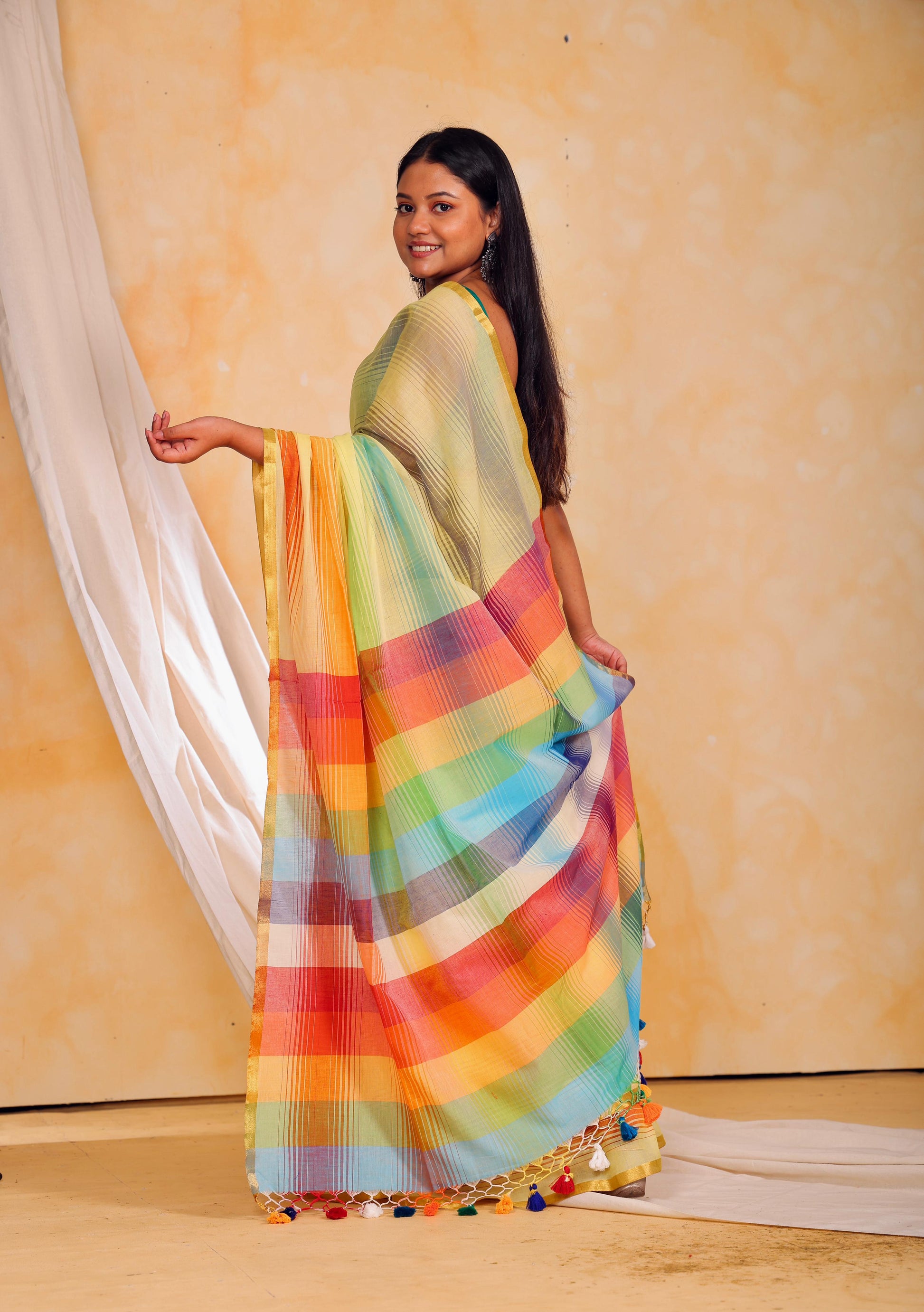 Multi colour pure Cotton Saree with Zari border and cute tussles on the palla