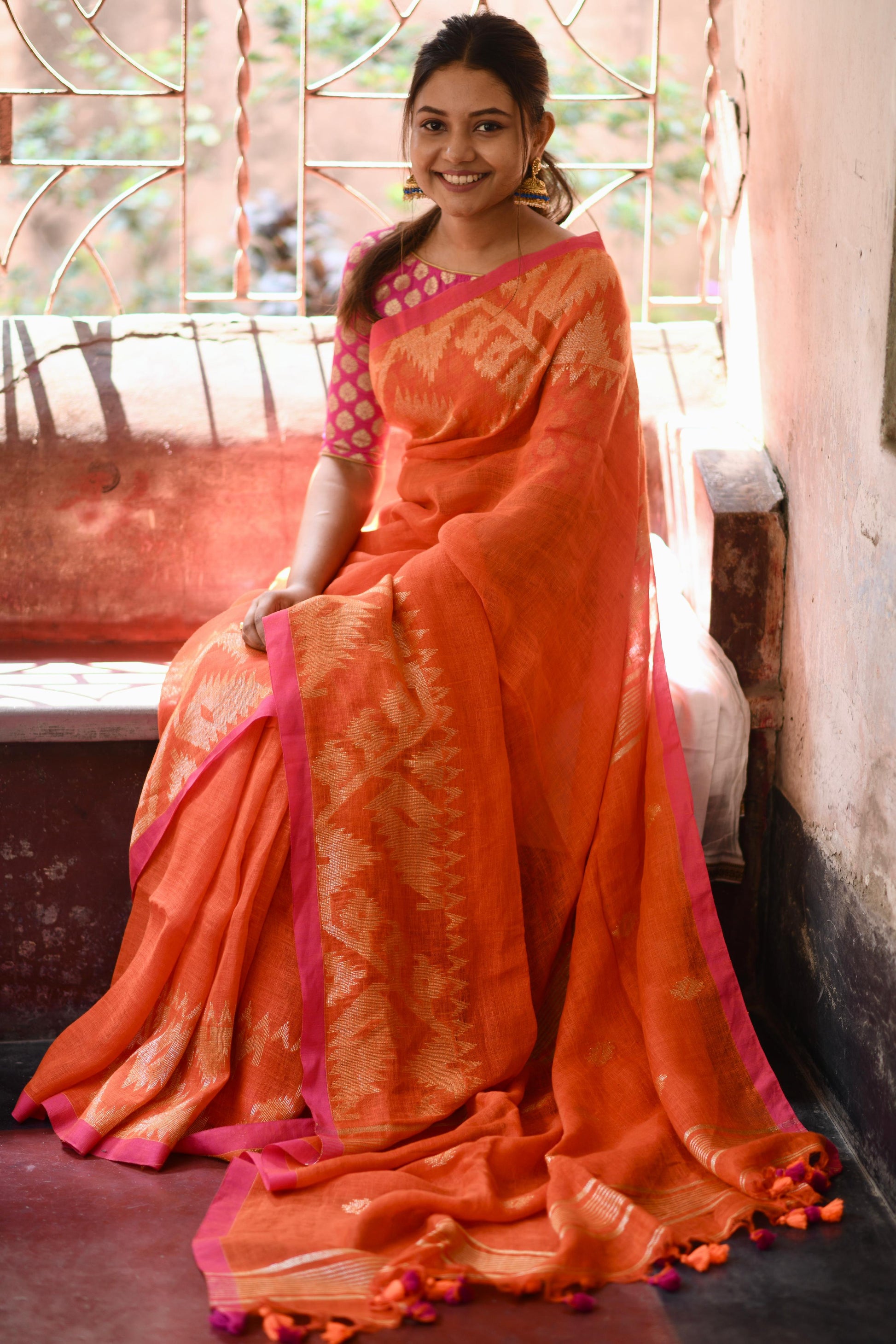 Handwoven pure Linen Jamdani Saree with cute braided tussles on palla.