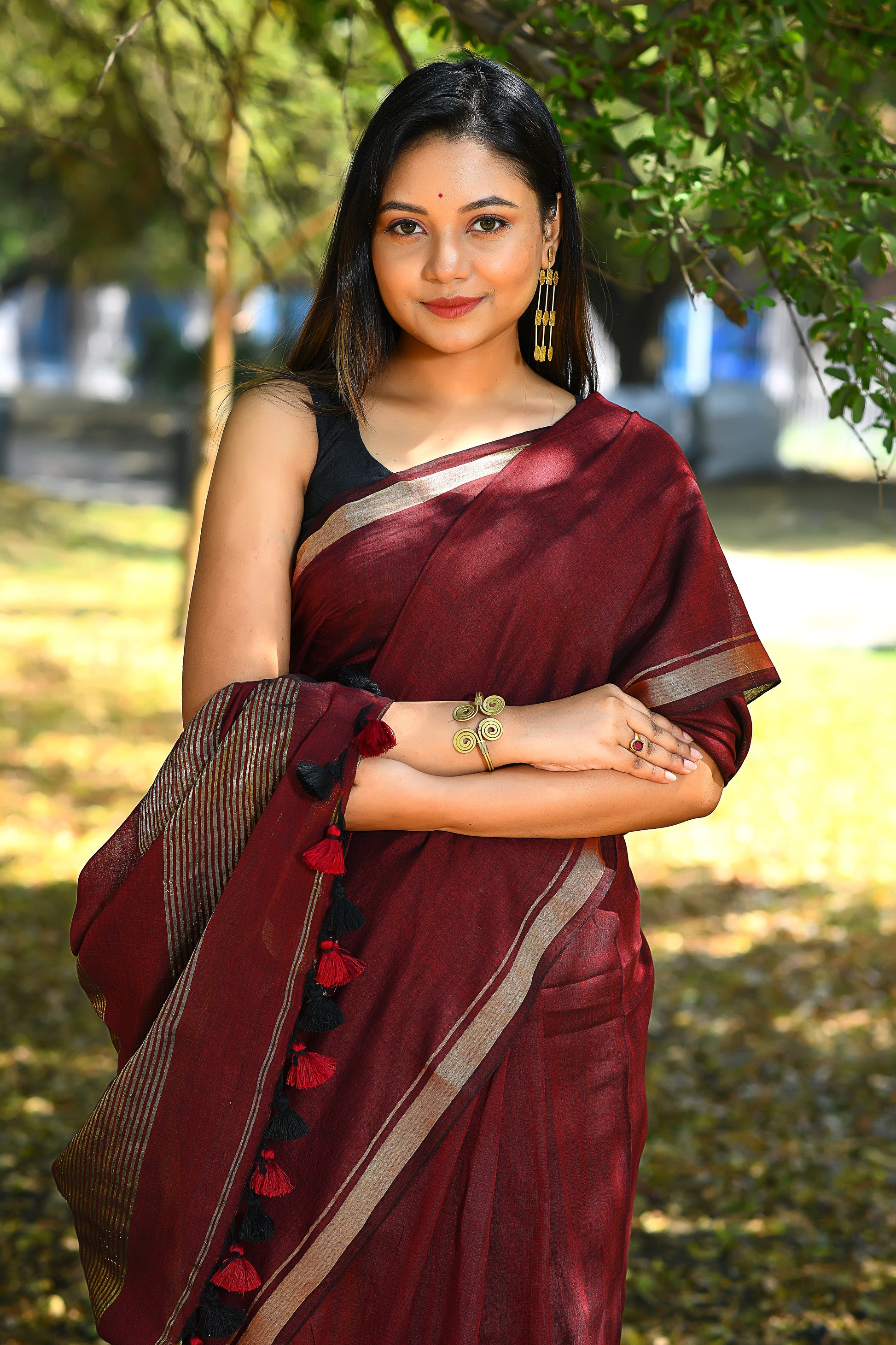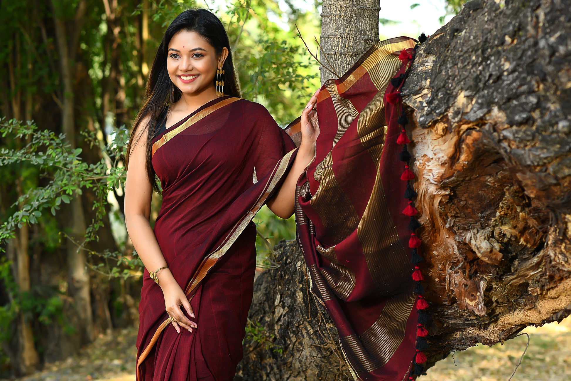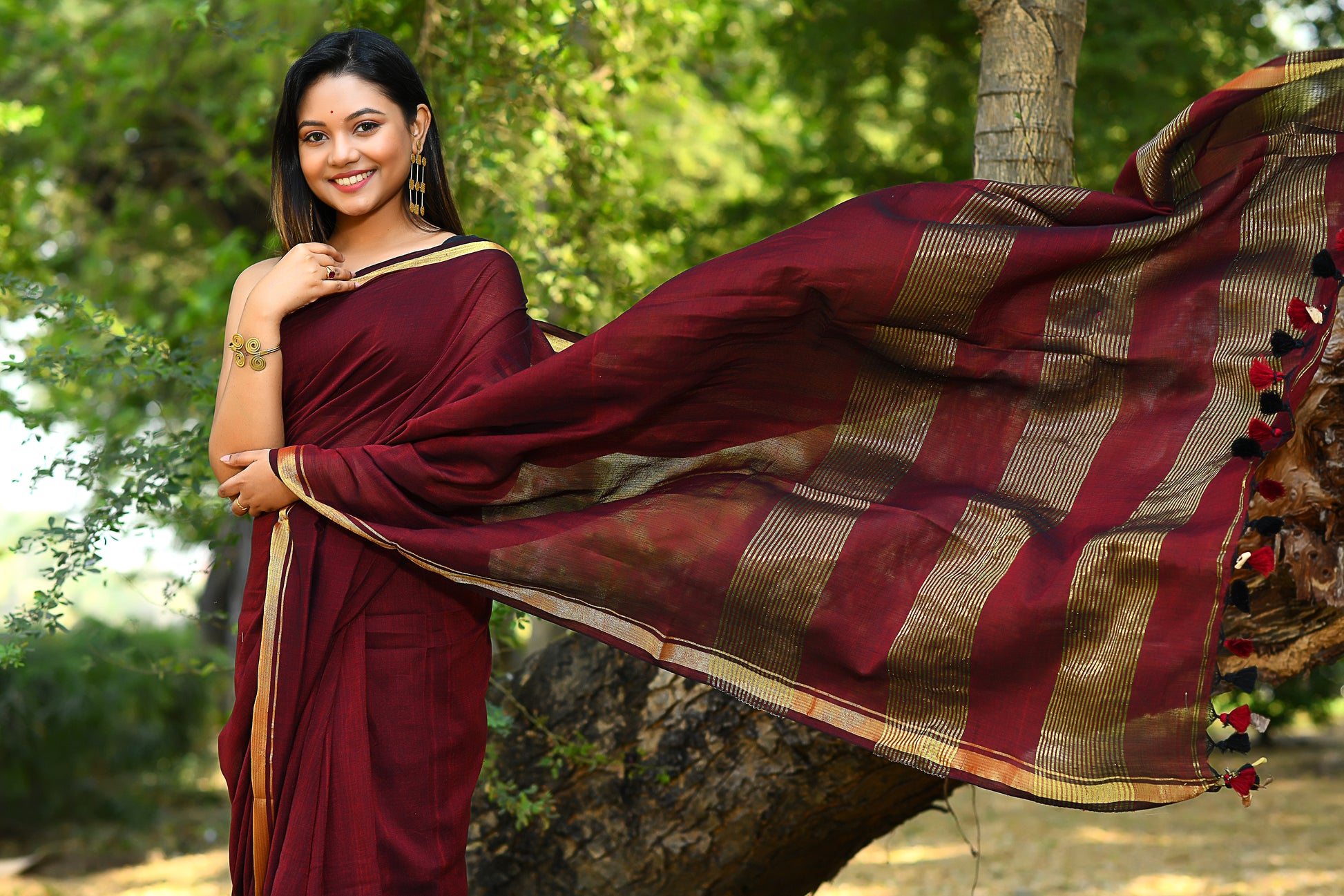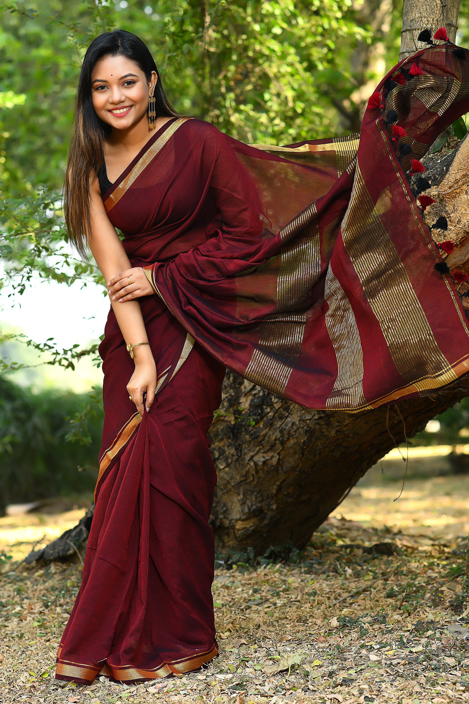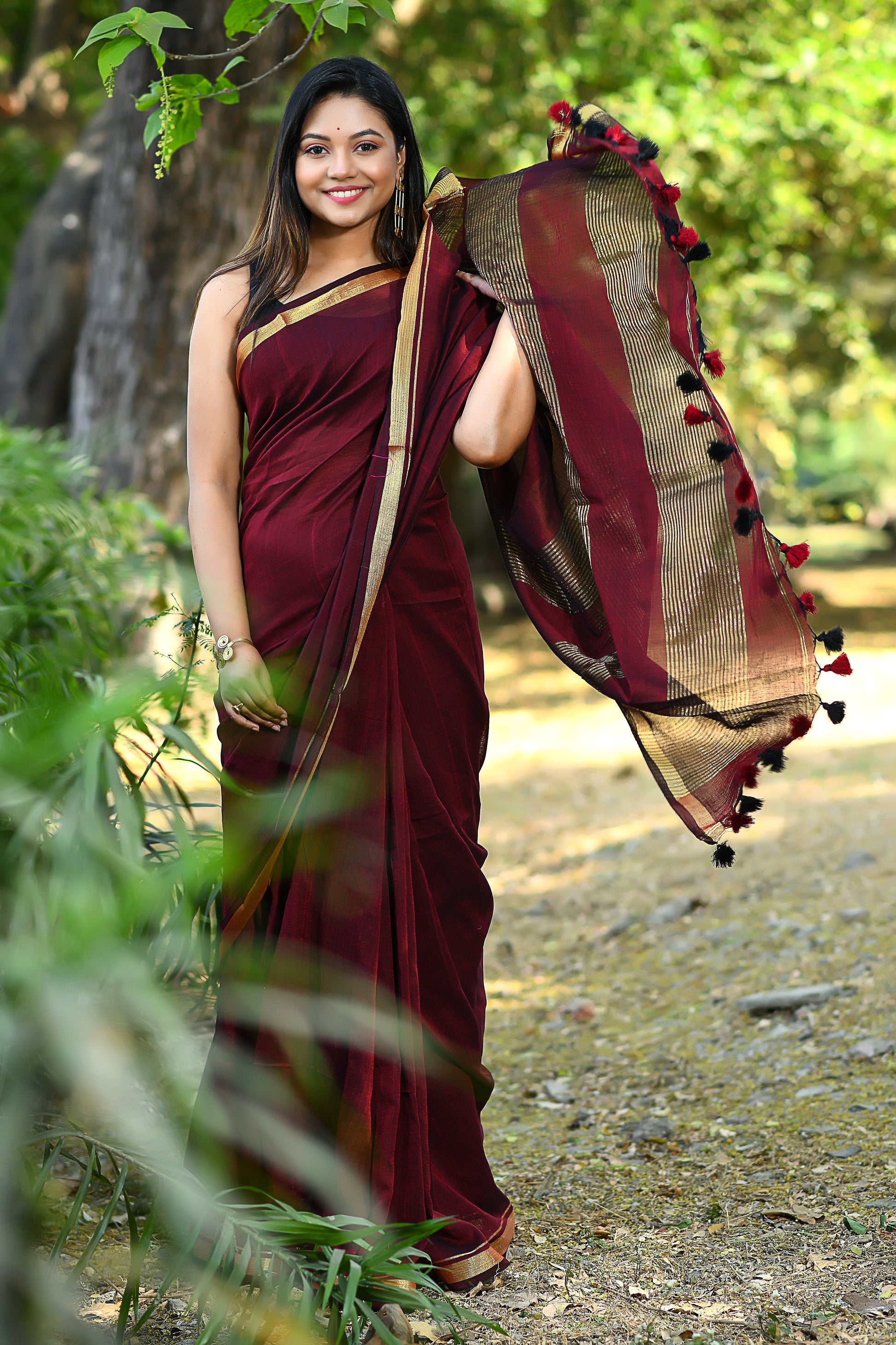 Handwoven, Soft, Lightweight, pure Cotton saree, with gold zari border and zari strips on palla. And adorned with cute braided tussles.