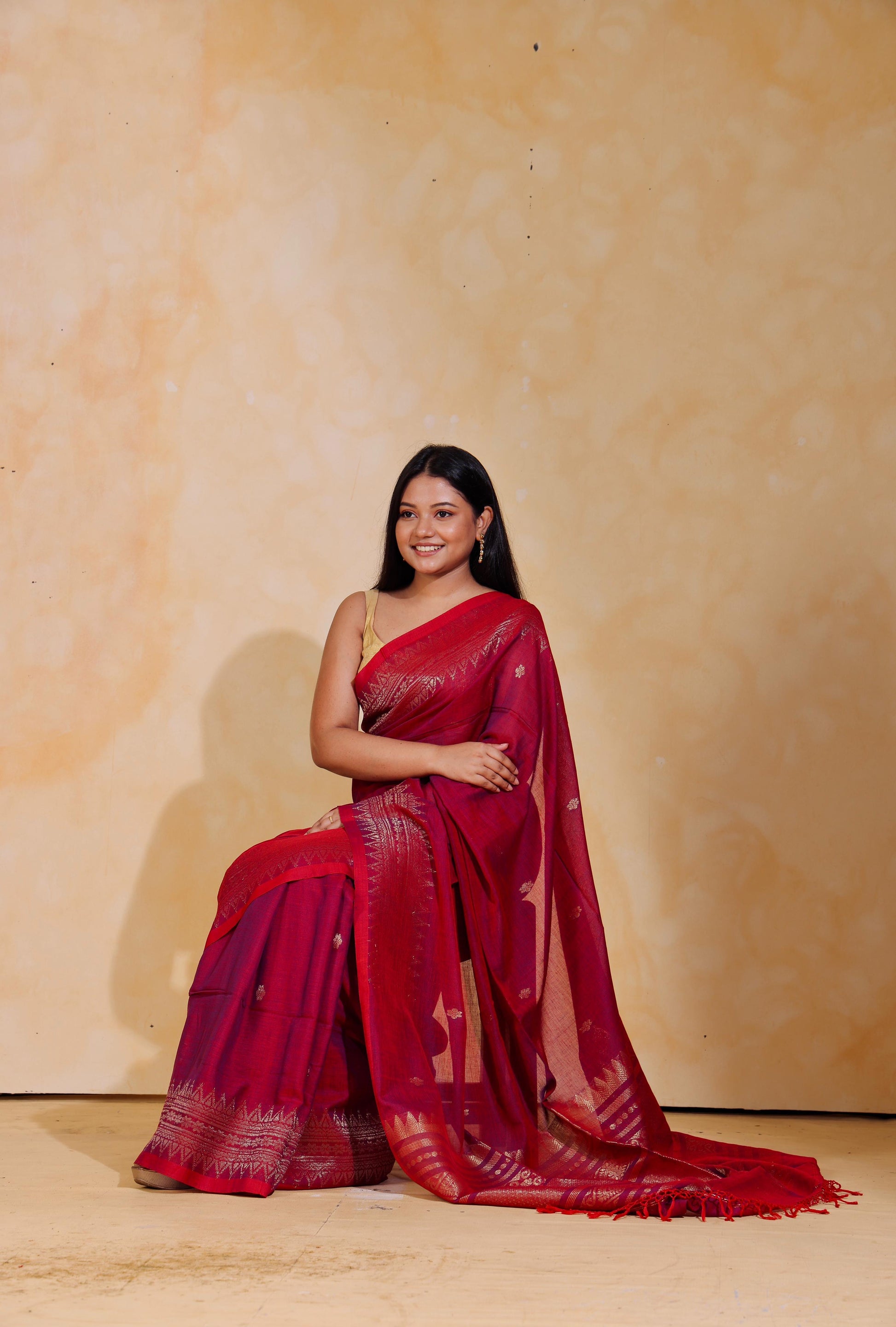 Handloom jacquard woven, pure Mercerised Cotton saree, adorned with tiny golden butas across body, embellished with intricate zari detailing along the border and palla.