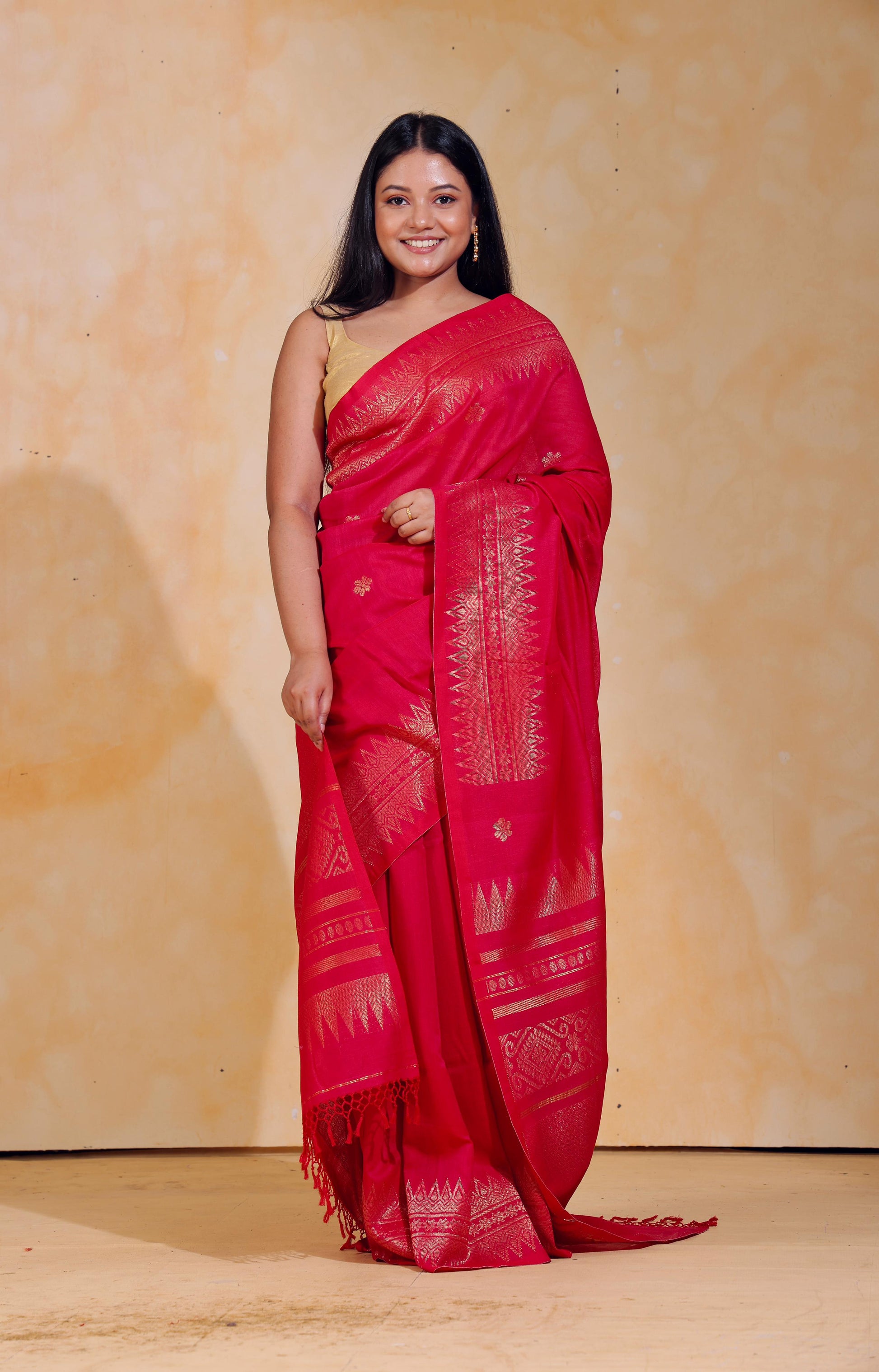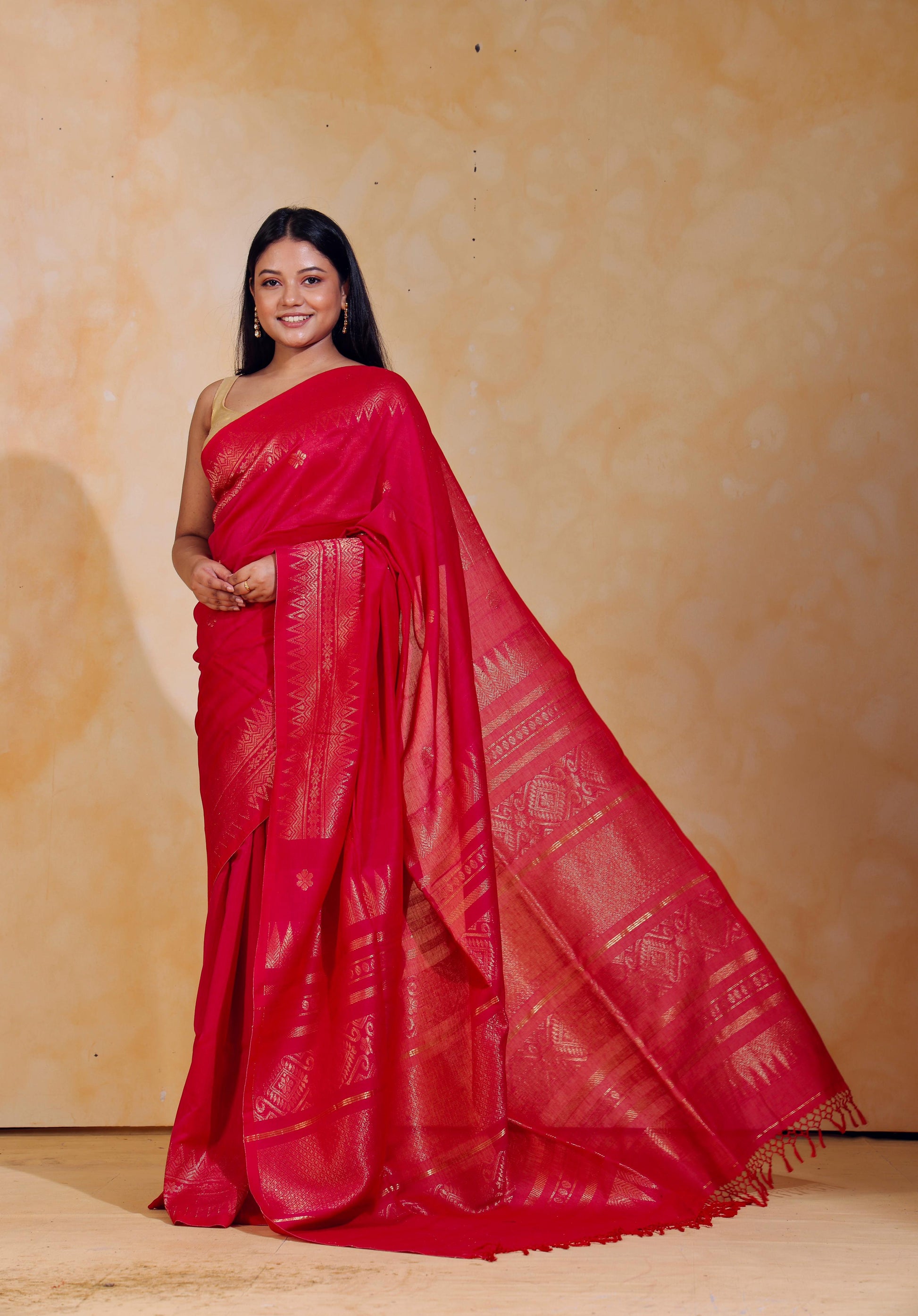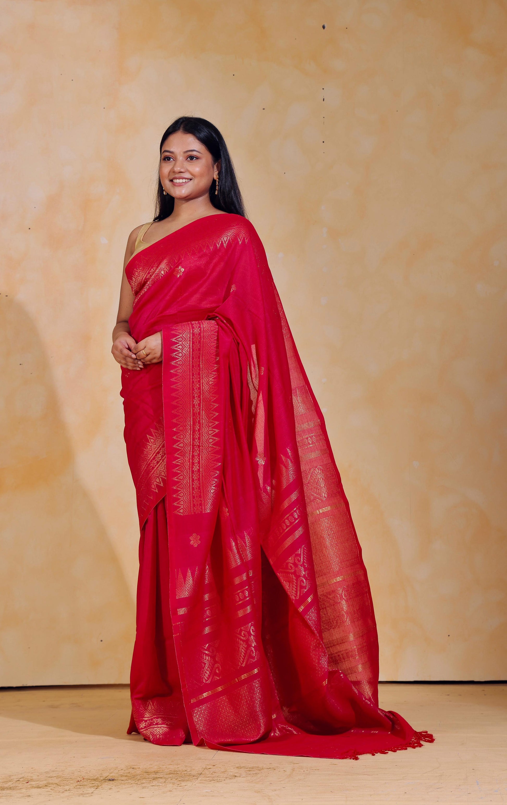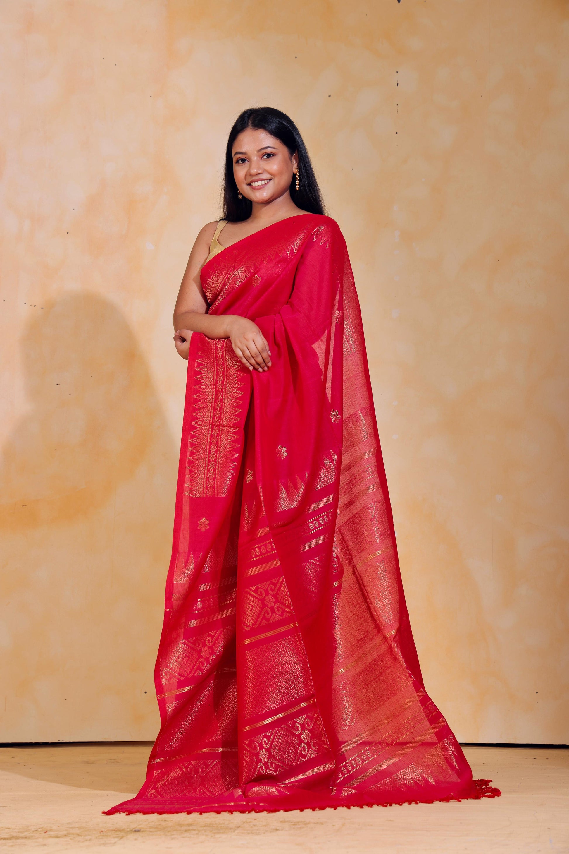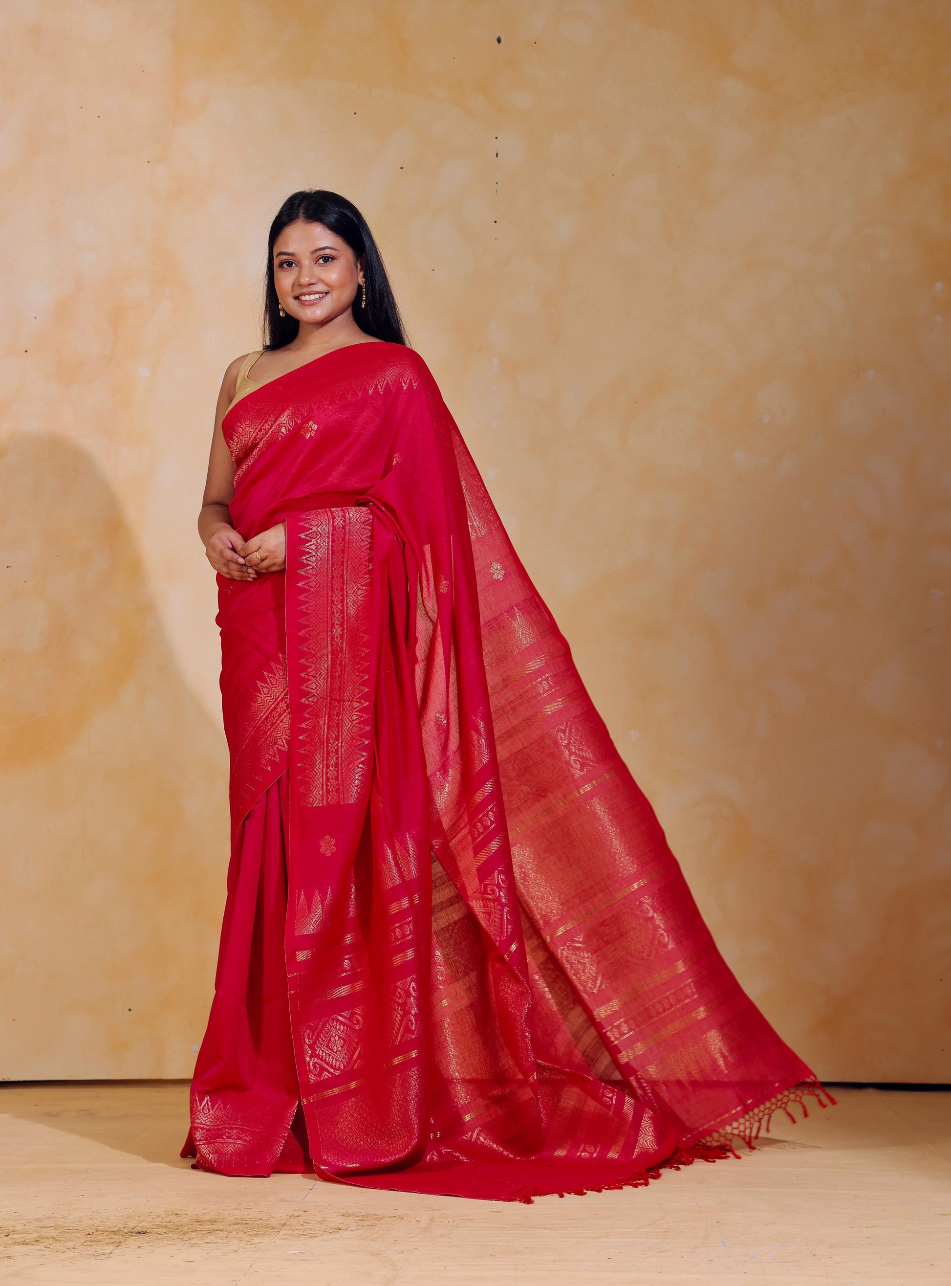 Handloom jacquard woven, pure Mercerised Cotton saree, adorned with tiny golden butas across body, embellished with intricate zari detailing along the border and palla.