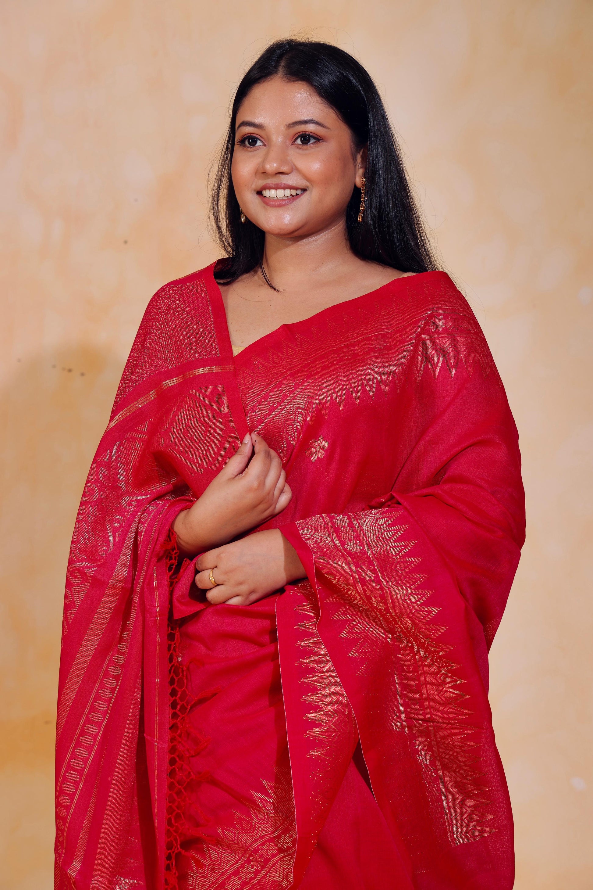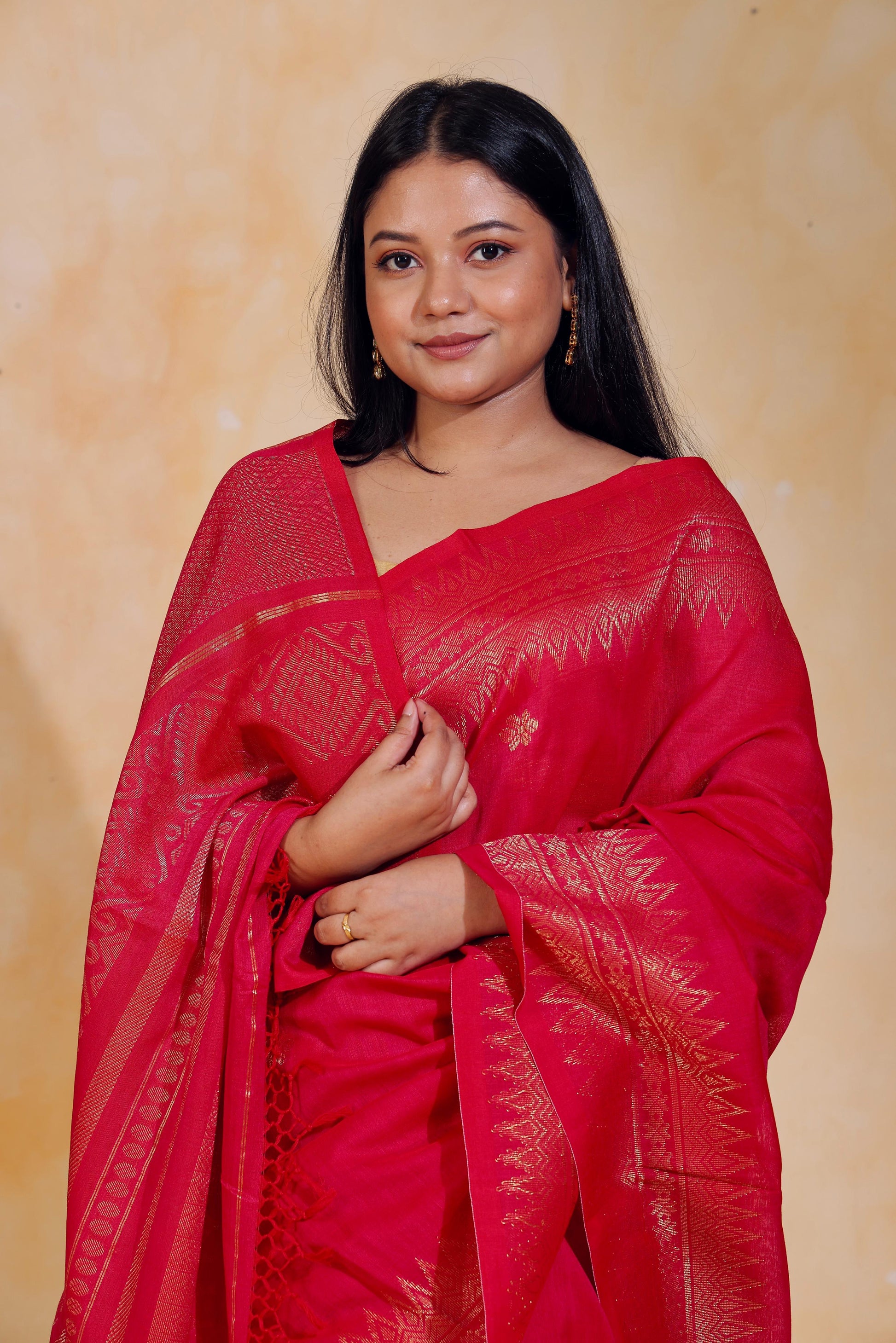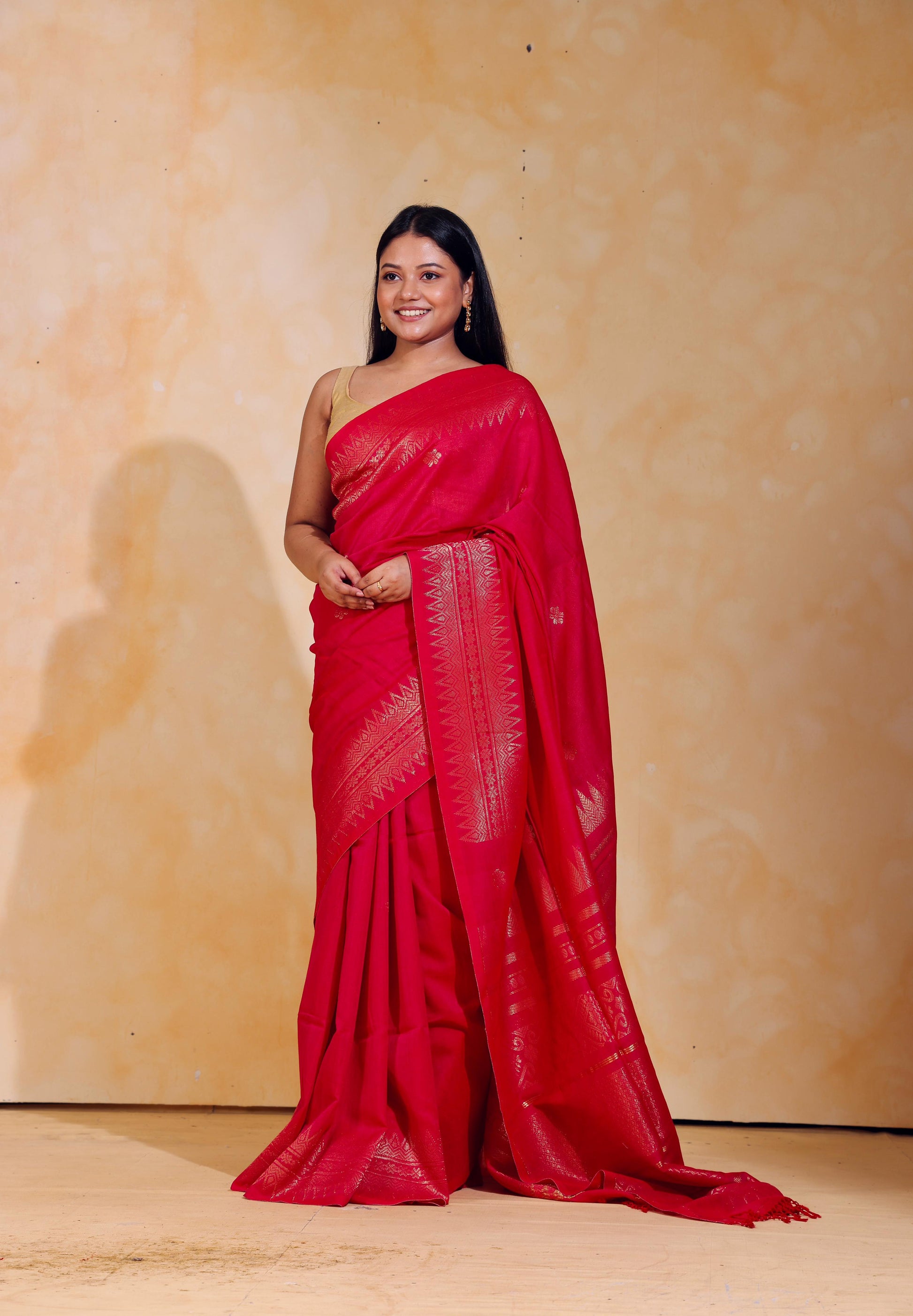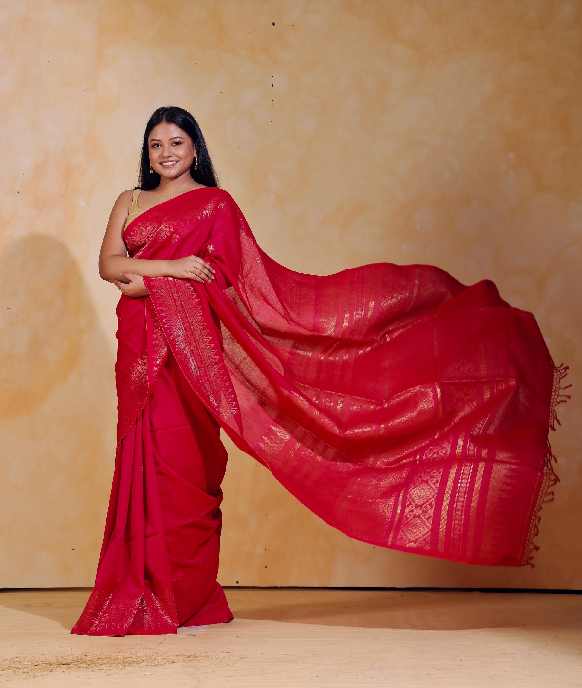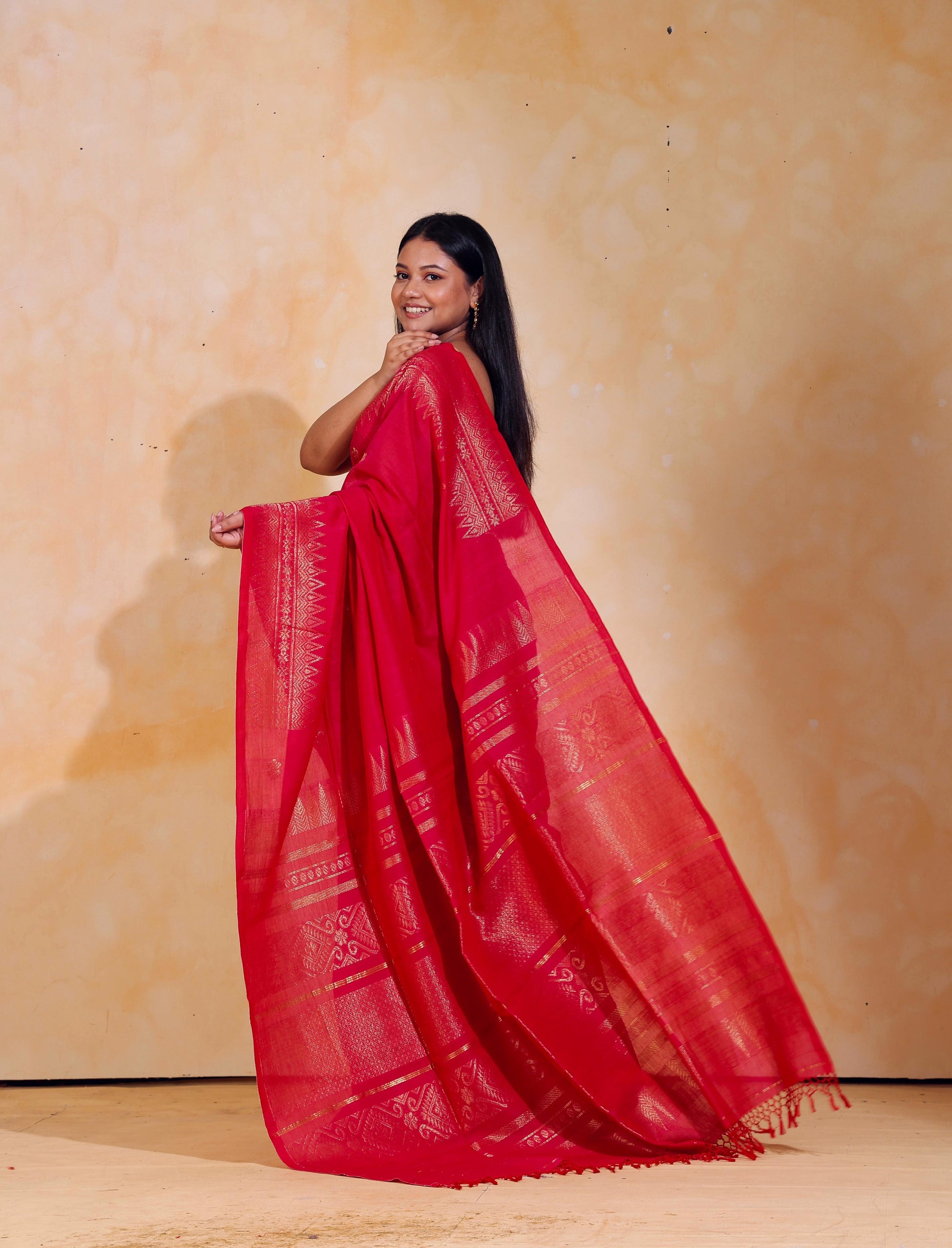 Handloom jacquard woven, pure Mercerised Cotton saree, adorned with tiny golden butas across body, embellished with intricate zari detailing along the border and palla.