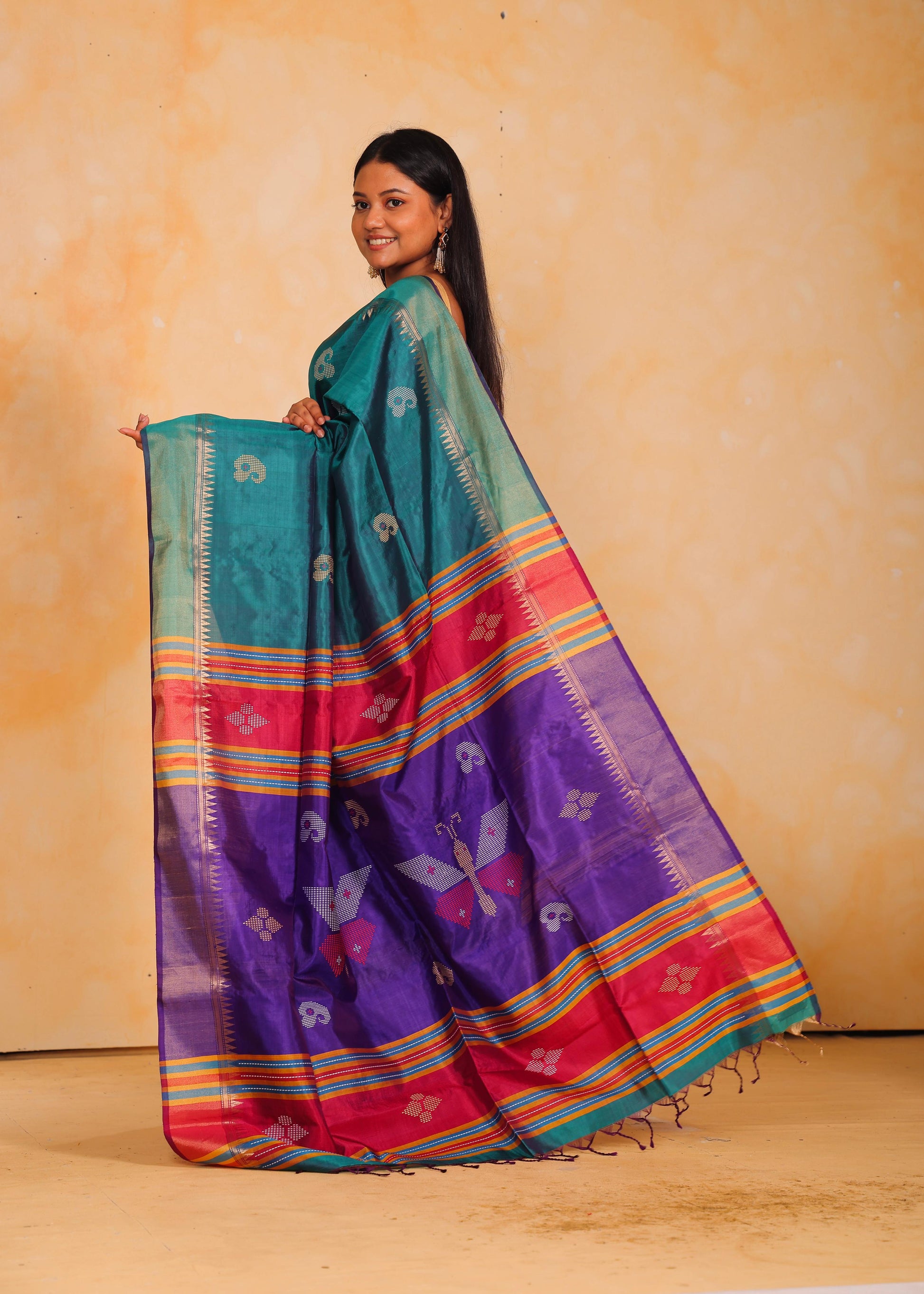 Handloom woven, luxurious kataan pure silk saree, adorned with intricate gold zari work butas and embellished with gold tested zari border and butterfly motifs thread work on palla.